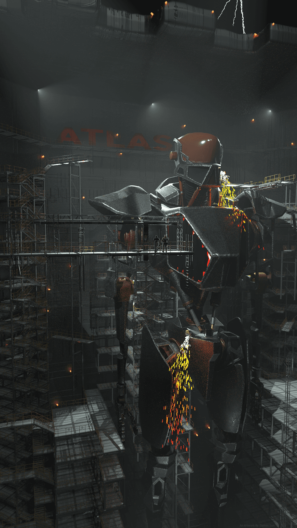 A CINEMATIC VISUAL STUDY OF INDUSTRIAL HARD-SURFACE DESIGN AND MASSIVE ENVIRONMENT NARRATIVES. Atlas explores the scale of mechanical structures through a hybrid 3D pipeline. It integrates hard-surface Maya modeling with procedural Houdini scene assembly and a fully procedural material system for the robot to achieve hyper-realistic wear. AI-generated human figures were utilized to enhance the industrial atmosphere, with final high-fidelity look development completed in Photoshop for a single-frame poster.